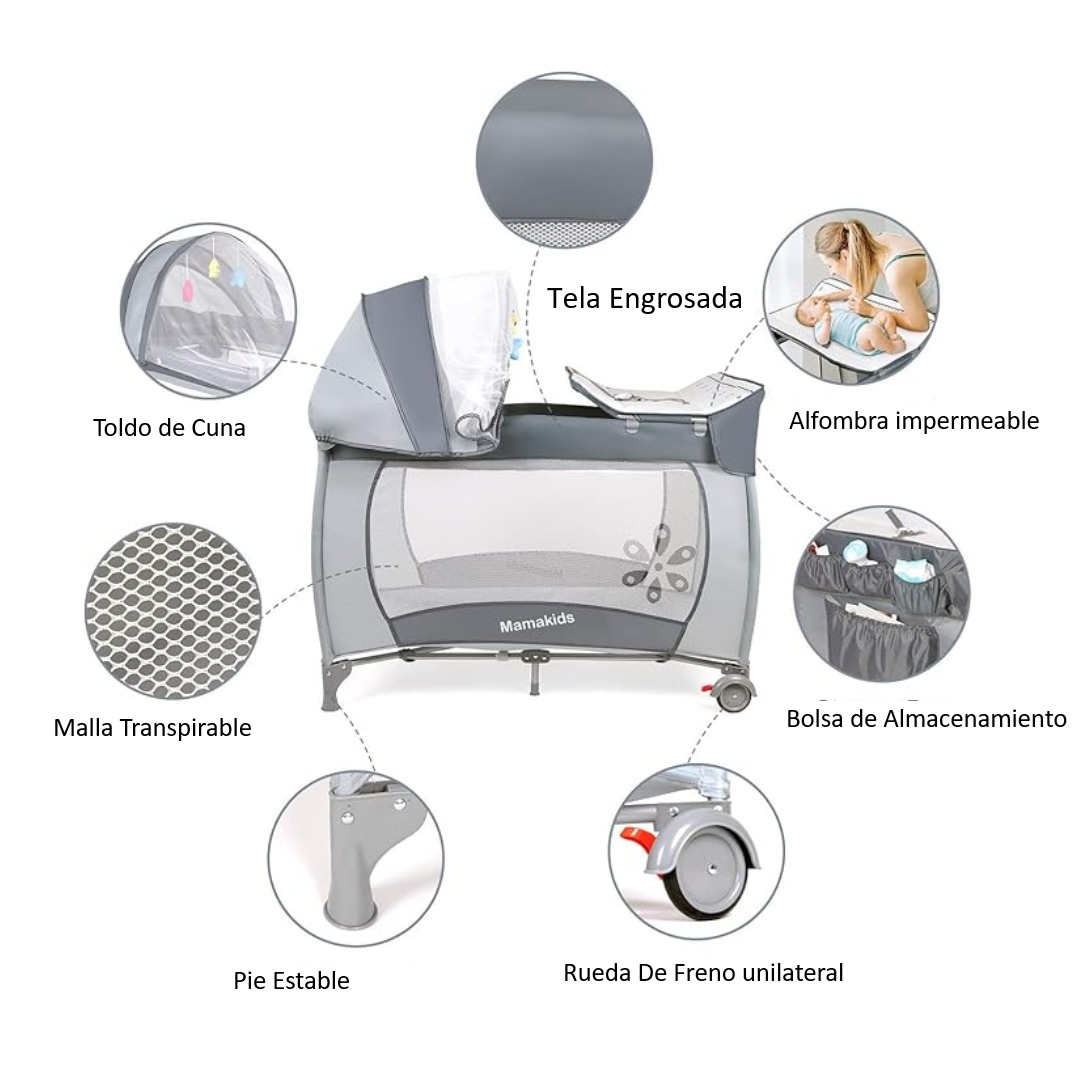 Además, cuenta con ruedas con freno para facilitar su traslado de una habitación a otra, y un sistema de plegado rápido tipo maleta, ideal para viajes o espacios reducidos. Su toldillo protector mantiene a tu bebé libre de insectos, asegurando un descanso tranquilo y seguro en cualquier momento del día.