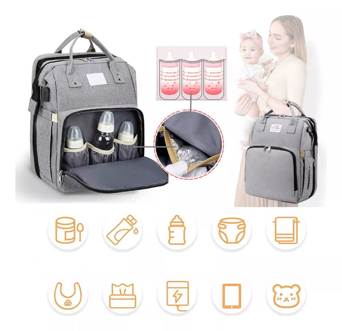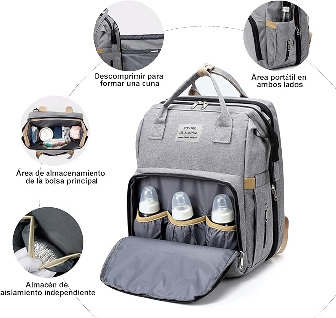 - Todo en uno: pañalera, cuna portátil y bolso térmico para padres modernos y organizados.
